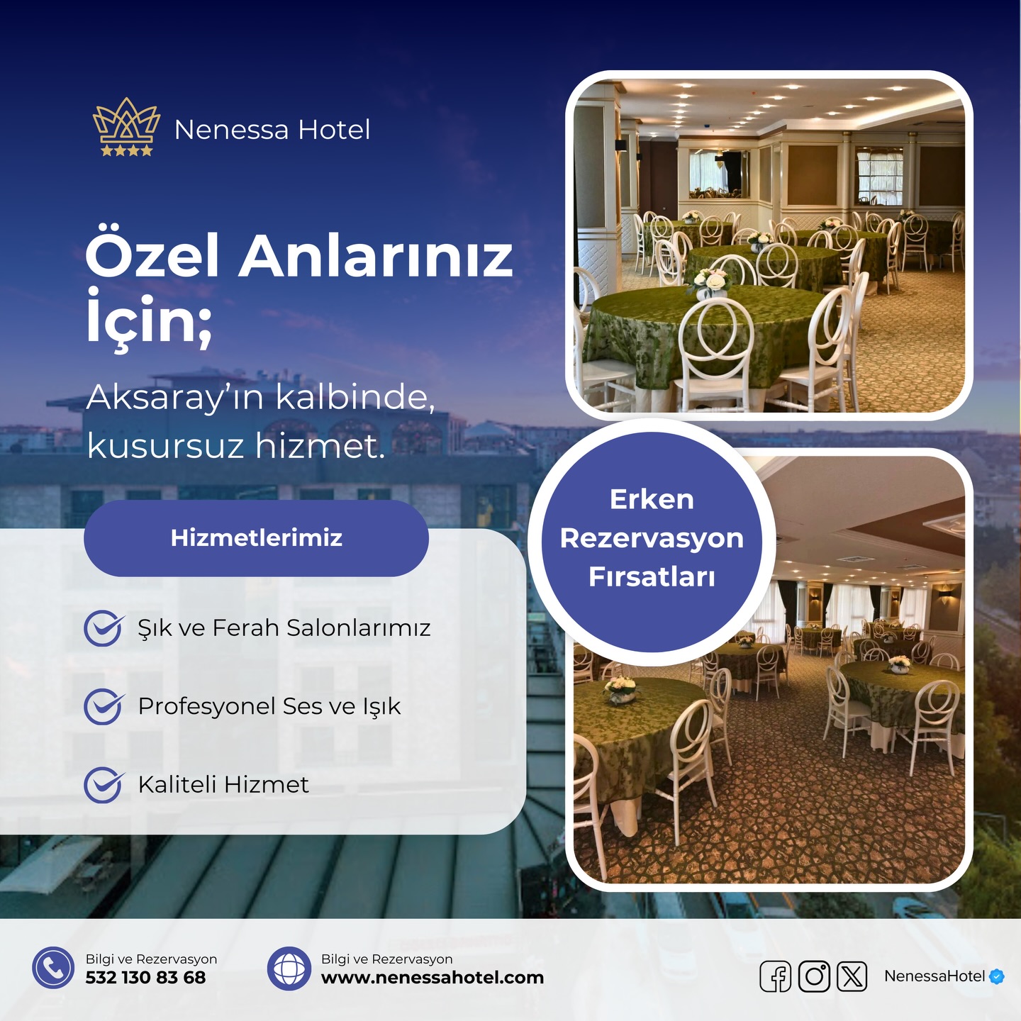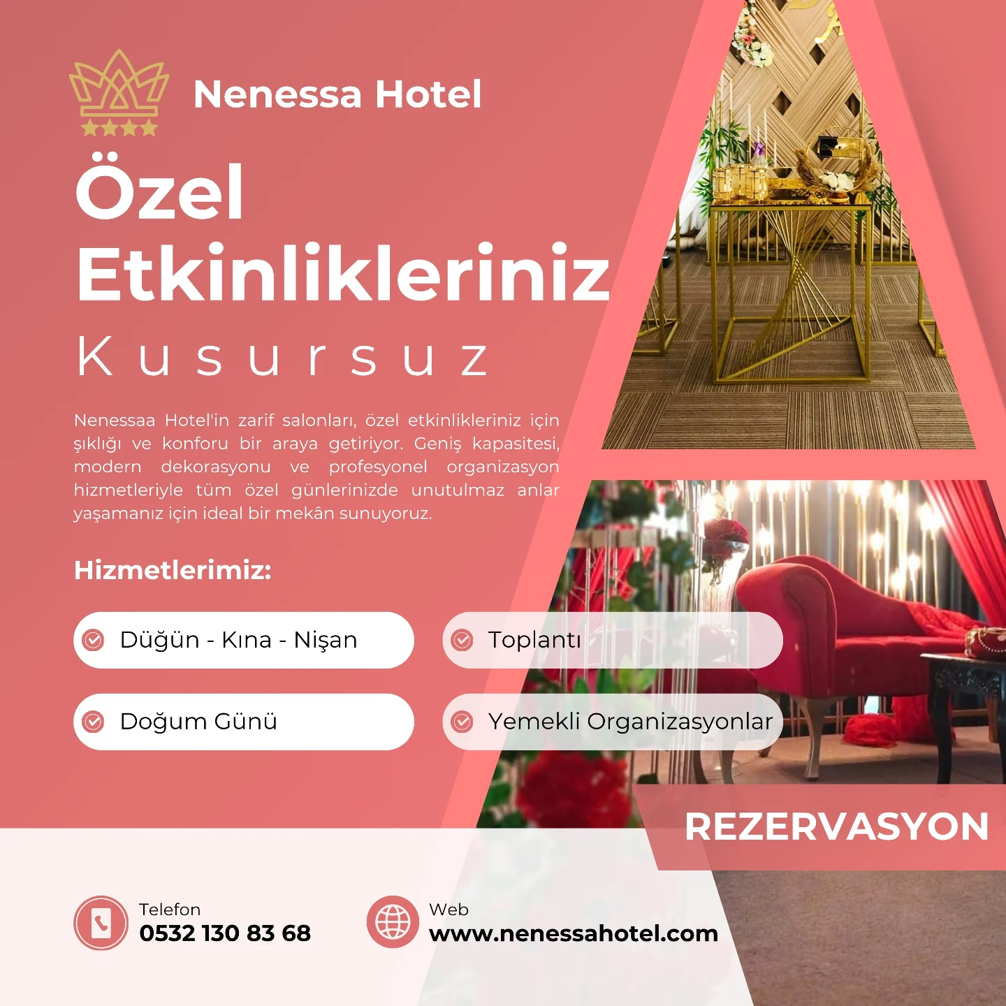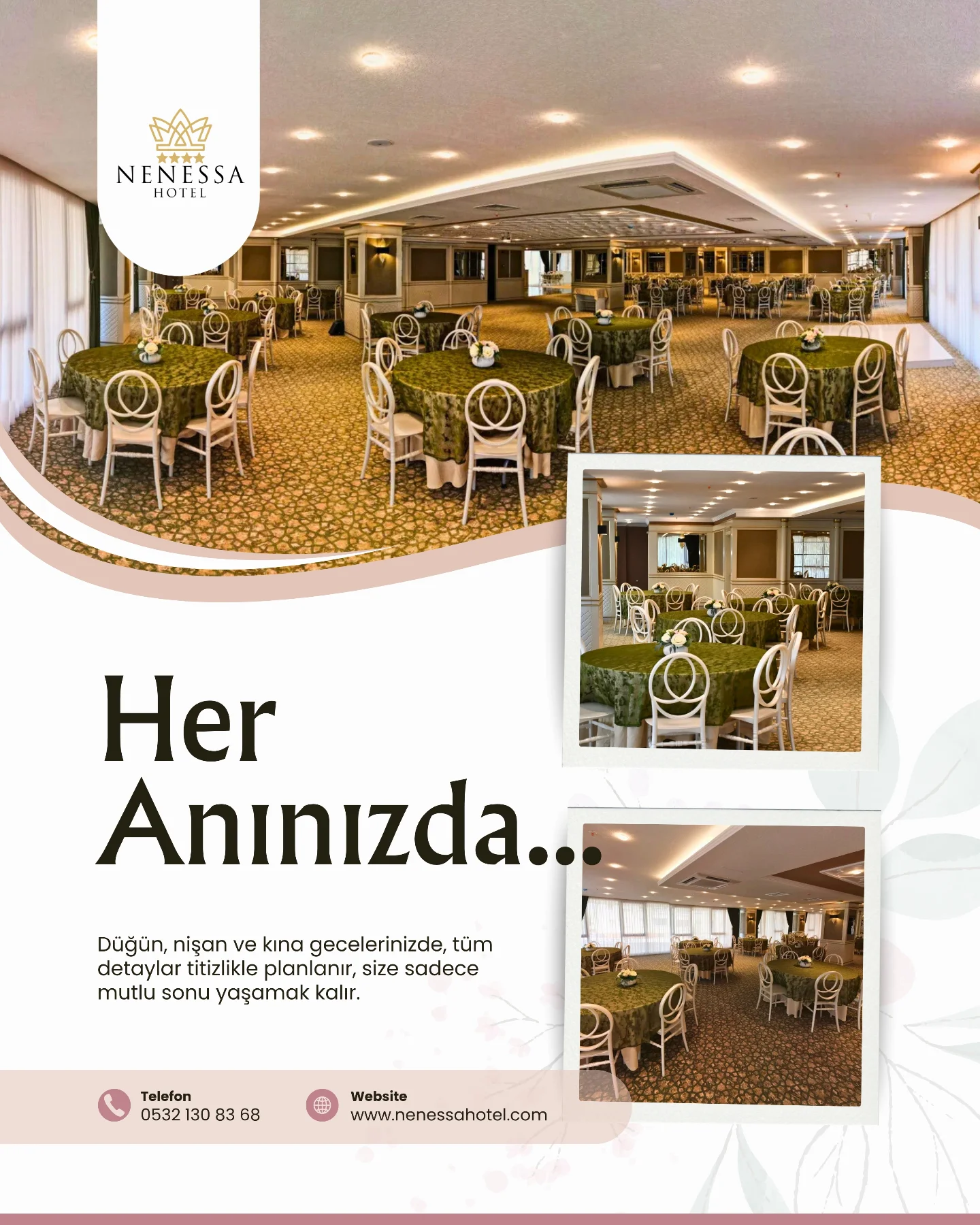 Düğün, nişan ve kına gecelerinizde hayalini kurduğunuz her an, Nenessa Hotel'in büyülü atmosferi ve kusursuz hizmetiyle gerçeğe dönüşüyor. ✨